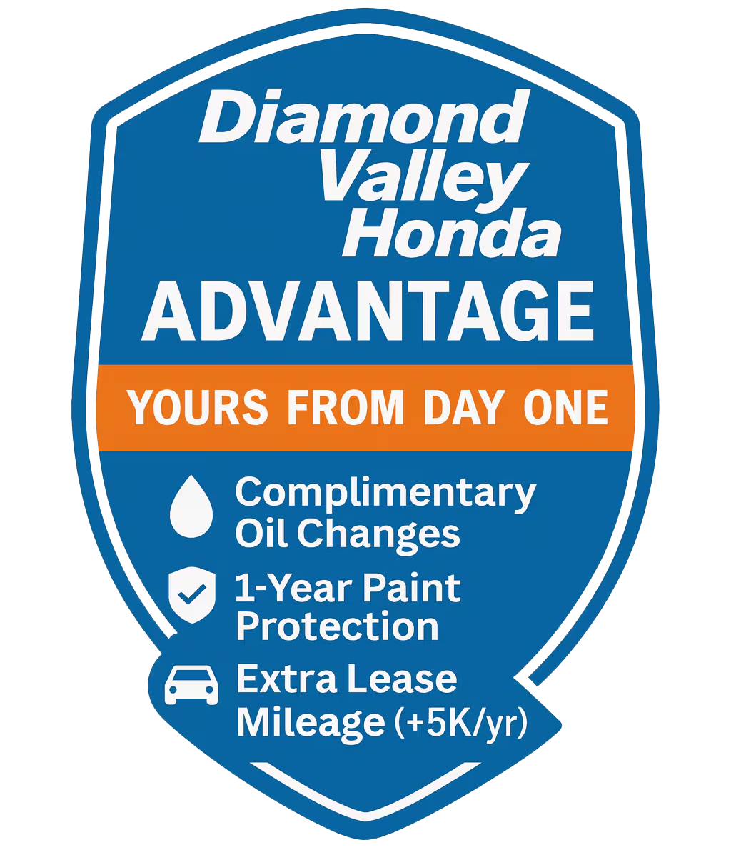The Diamond Valley Honda Advantage and all associated programs are valid exclusively at Diamond Valley Honda. Participation requires that all factory-recommended maintenance be performed through the dealership's service department. Lease Advantage benefits apply only when the leased vehicle is returned to Diamond Valley Honda at lease-end. Terms and conditions apply. See dealer for complete details.