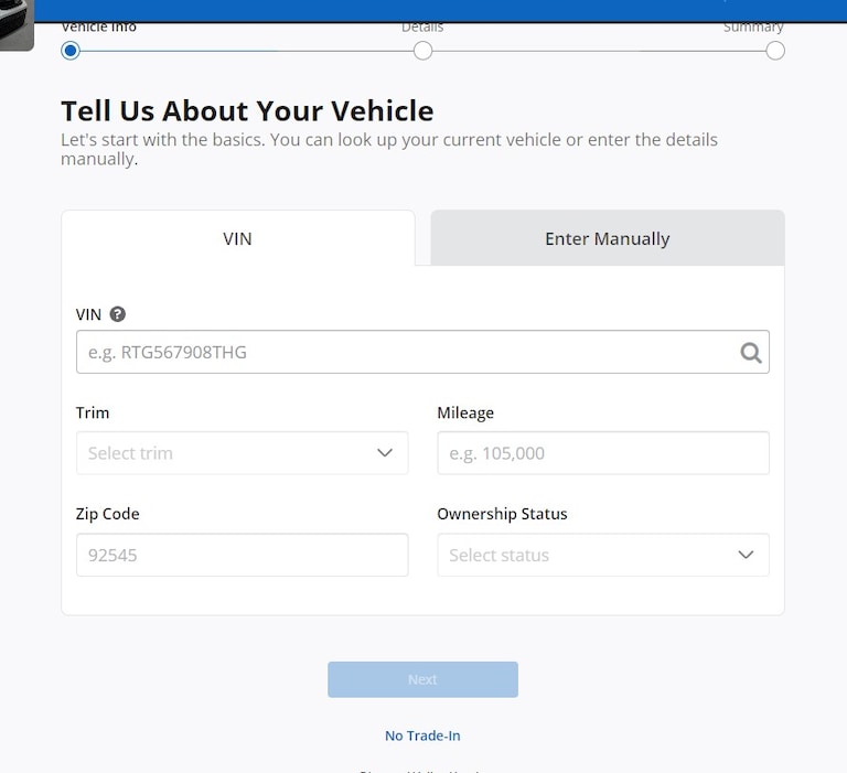 Looking to trade-in your vehicle? Easily get a vehicle trade-in estimate online with the help of our vehicle trade-in estimate tool. Just fill out a few forms detailing things like model year, trim, features, and then you'll be able to get a vehicle trade-in estimate.